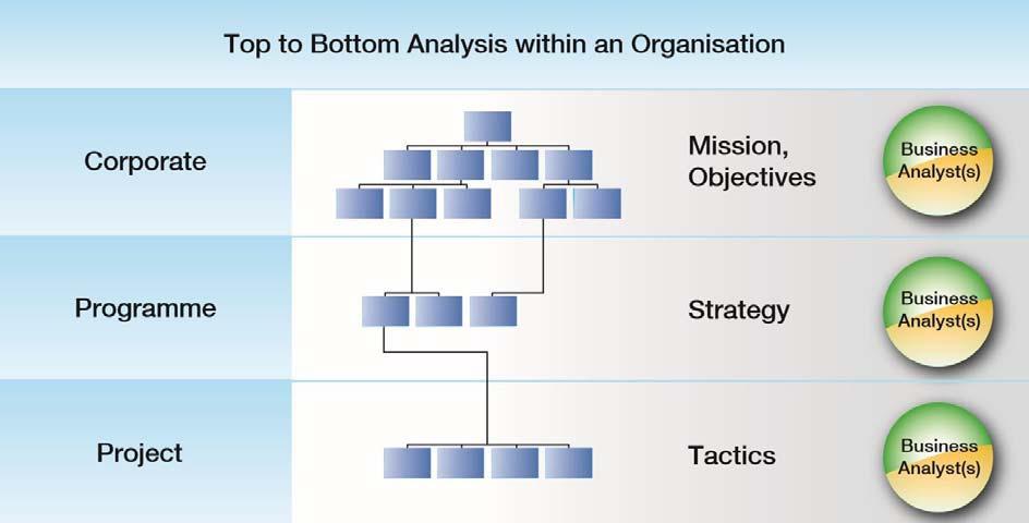 Auf jeder dieser drei dargestellten Ebenen sollten Ressourcen mit Fähigkeiten eines Business Analysten agieren. Zu dessen Aufgaben gehören: